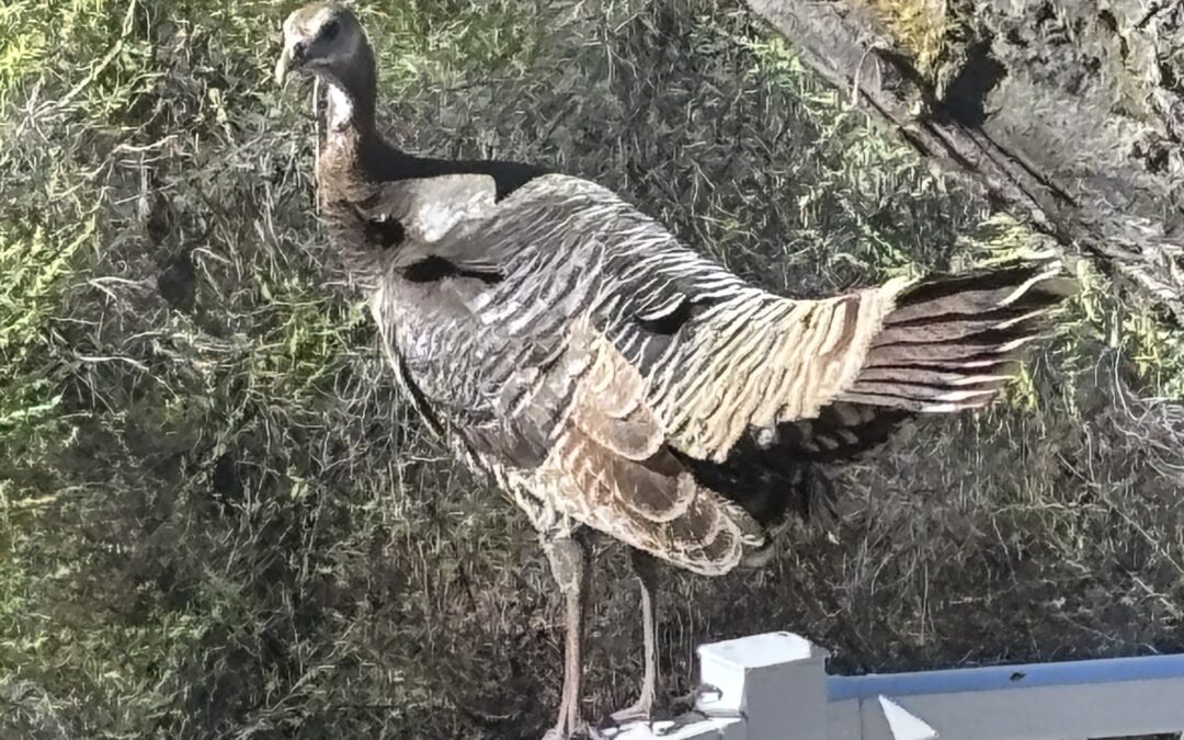 Karen and I started feeding the birds again. We have two feeders and have a daily gaggle of various birds eating seeds and getting a drink from the fountain. We have enjoyed several groups of travelers heading north I suppose and many quail, doves, and squirrels. The squirrels are very smart and tenacious but our clever hanging spots have relegated them to clean up crew. The picture this week is a Merriam turkey, she curls up in the bushes under the feeder and drinks from the pond. She goes nameless but we are concerned that she is running unattached, no mate. The bird makes the most interesting sounds and is bothered by nothing except Mmma, our dog who sends her flying occasionally. It is a joy to watch her launch off the railing and glide gracefully to a nesting tree in the Canyon. I realize we are not supposed to feed the turkey but she really is feeding herself.